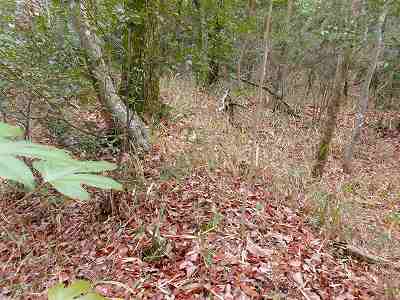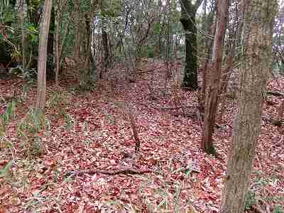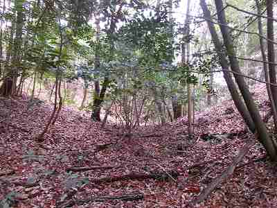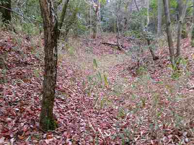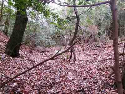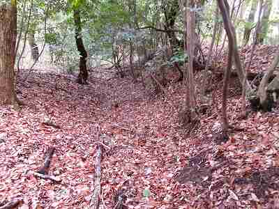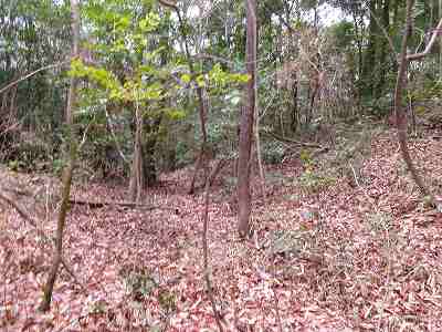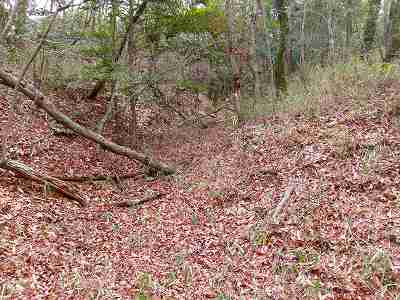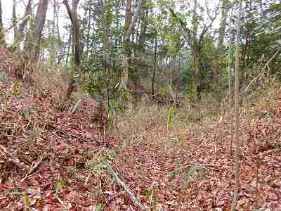 | その先の堀切。油を塗った笹の葉を置いていて、逆に羽柴勢に火を付けられたという伝承のある部分である。 | さらに先にある大堀切。 |