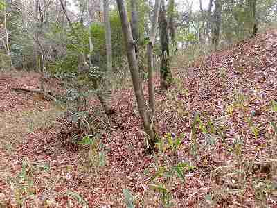 搦手口を降りていくと最初の堀切があった。この堀切についてはある伝承が存在しているようで、その案内が設置されていた。この城が羽柴軍の攻撃を受けた際に、敵が滑って登ってこられないように、竹の皮に油を塗って、この斜面に敷き詰めていたという。ところが羽柴勢はそれに火をつけたために、竹の皮はたちまち燃え上がり、その火は城内にも延焼し、城が落城するきっかけになったのだという。かなり眉唾な気がするが、なかなか興味深い話である。