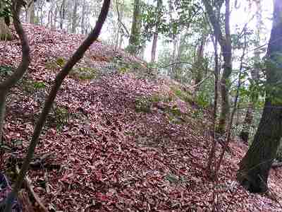 | そこから比高80mほど登っていくと大手門跡のところに出る。 | その先の登城道の脇にある櫓台。 |