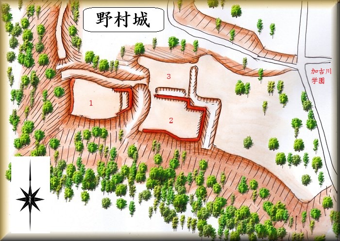 野村城は3郭構造の城で、規模はそれほど大きなものではないが、堀はしっかりと構築されており、形状を明確に把握することができる城となっている。