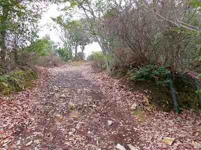 そんなわけで「なんで車道を延々歩かなければならないんだよ〜」とこぼしながら歩いていく。登城道とは言え車道だけに傾斜はそれほど急ではなく歩きやすい。ただし、時間がかかる。この車道を歩いていく途中に毘沙門岩があり、そこから旧登城道との分岐点があった。旧登城道は急峻なようだったので、登りは現在の登城道を利用し、帰りに旧登城道を通ってみることにした。ちなみに最短の「鎖場コース」というのもあったが、こちらは通っていないので、どれほど危険なのかは不明である。