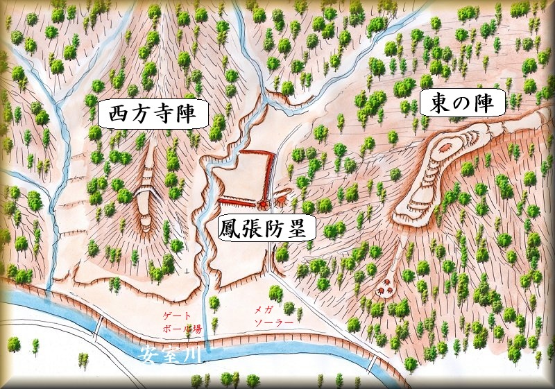 西方寺陣の場所 鳳張防塁の場所 東の陣の場所