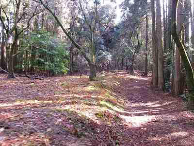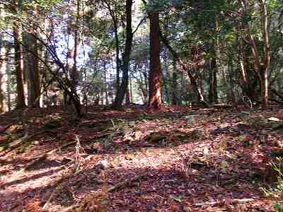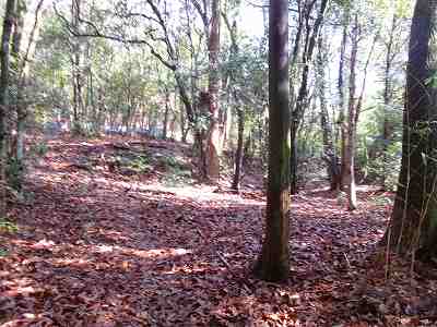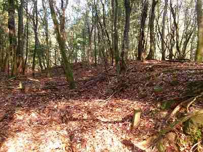 ゲートボール場の西側辺りから山稜奥の方に進んで行くと墓地がある。その辺りから西方寺陣を目指していく。比高60mほどの山稜先端部である。