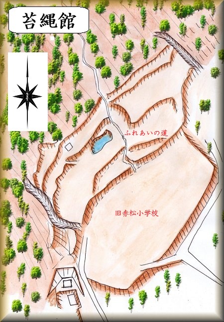 智頭急行苔縄駅の北西に旧赤松小学校があるが、この学校の敷地と背後の山稜に展開する平場群が、苔縄館の跡である。