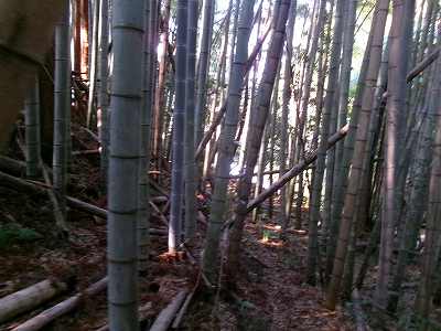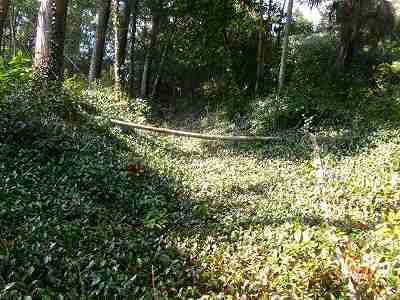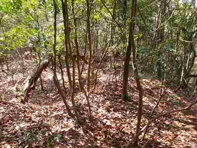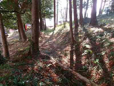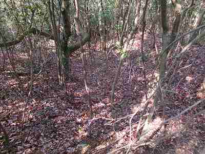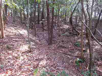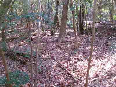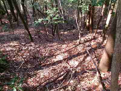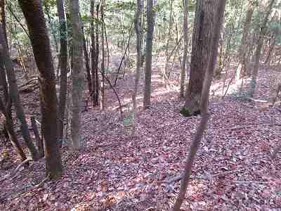 入り込んですぐに帯曲輪のような地形の所に出る。登城道などはないが、たいしてヤブでもないので歩きやすい地形である。