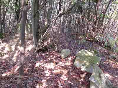 その手前に1本、右手に分岐するところがあり、最初、そちらかなと思ってしまったのだが、そこから上がると5郭の下あたりに出て北東の曲輪群の所に出ることになり、そこから登っても城内に到達することは可能である。