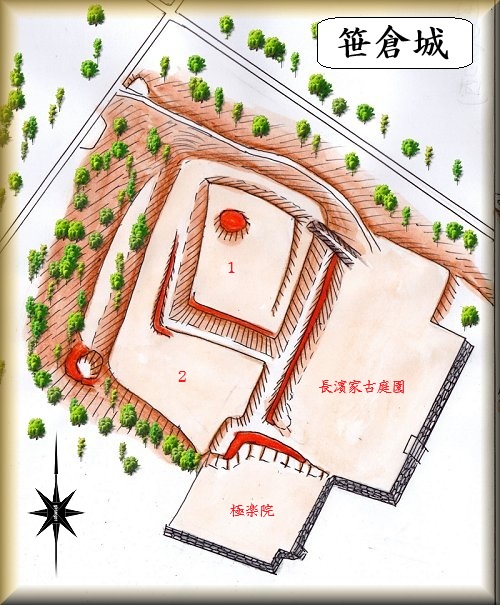 笹倉城のすぐ南に極楽院があり、また東側には長澤家庭園があって、こちらから簡単に城内に入れそうなのだが、私有地なので勝手に入っていくことができない。