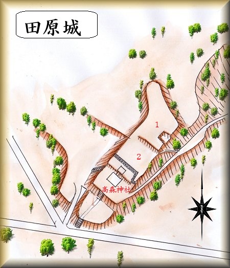 田原町にある高森神社のある比高15mほどの台地先端部が田原城の跡である。