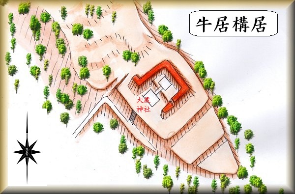 牛居町の南端部にある大歳神社の祭られている低い台地の先端部分が牛居構居の跡である。