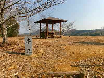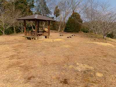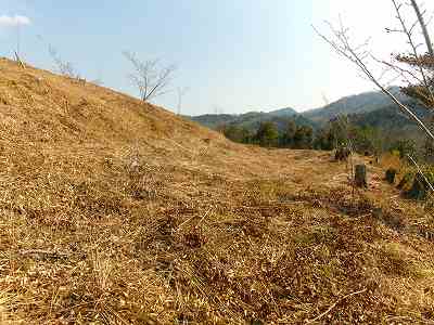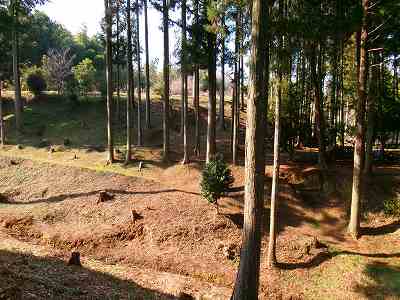 山頂に登ると、 五つの郭跡の削平地が階段状に並んでいる。一番東の山頂に一の郭(主郭)があ り、この五つの郭を空堀と土塁が取りまいている。