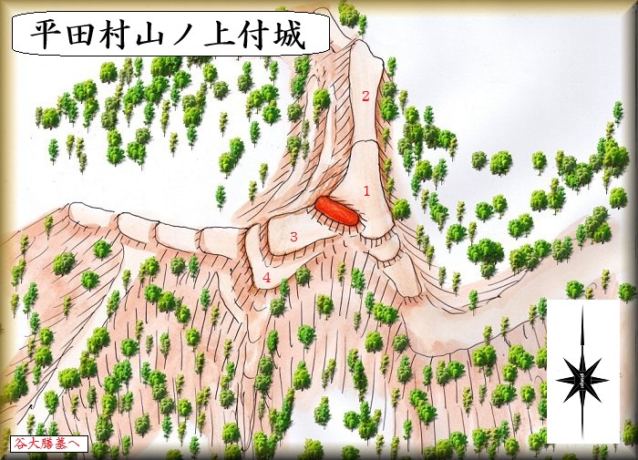 山頂部1の南側には大きな土塁が盛られ、北側に2郭、土塁の南側に3、4といった郭が配置されている。