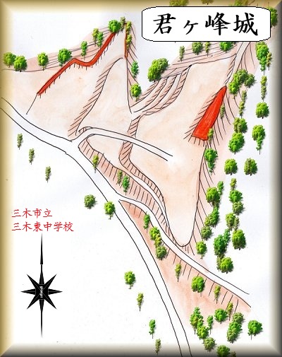 君ヶ峰城は、三木市立三木東中学校の東側にある比高20mほどの台地に築かれていた。