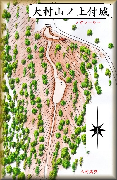 大村病院の北西側上にある比高20mほどの山稜一体が大村山ノ上付城の跡である。