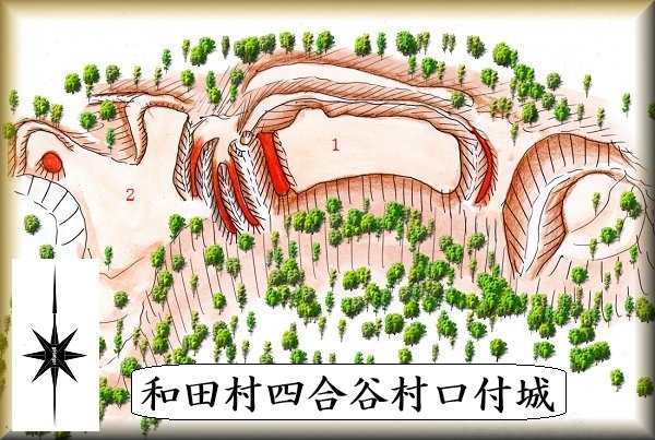和田村四合谷村口付城は吉田住吉城とも呼ばれ、御春池の東側の比高20mほどの山稜に築かれていた。