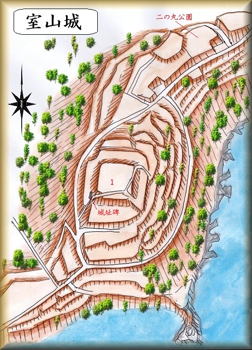 室山城は室津湾に臨む岬の先端部近くに築かれている。