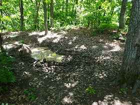 それを進んでいくと、一段高い段差が見えてくる。この上が1郭である。主郭であるとはいうものの規模は小さく、長軸20mほどでしかない。それでも周囲には土塁が廻らされているので主郭らしい雰囲気はある。中央部には水がたまった窪みがあった。これが井戸であるというが、後世に開けられた穴のようにも見えなくはない。