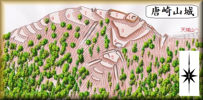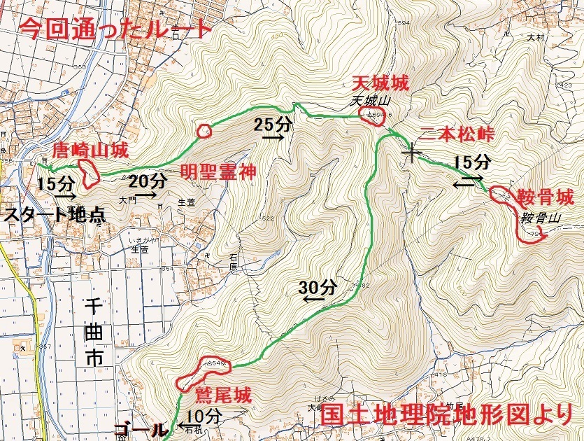 該当する城郭は、鞍骨城、唐崎山城、天城城、鷲尾城の4城である。天城城に行くためのスタート地点としては、唐崎山城、鷲尾城の2つがあるが、地形図を見てみると、唐崎山城から天城城に行くルートの方が平坦で楽そうである。