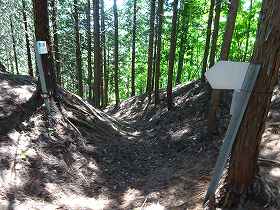| 西側の下には古墳の案内板と標柱がある。 | その先に進むと2郭手前の二重堀切が見えてくる。 |