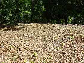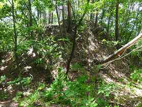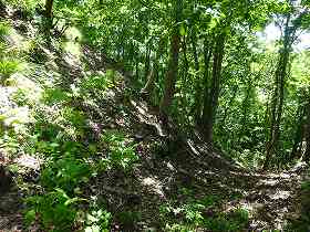 1郭から登山道方面に向かうと、一段低いテラス状の郭があり、その下が高さ5mほどの切岸となっている。手持ちの図面では、この先が大堀切となっている。しかし、実際には外側部分はたいした深さがなく、堀切と言えるのかどうか疑問を感じる。あるいは後世の改変で埋められてしまったのであろうか。