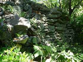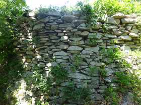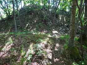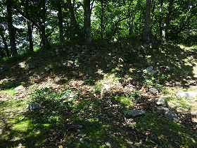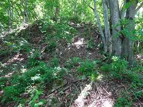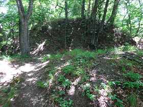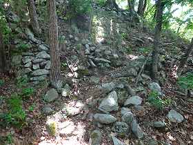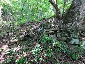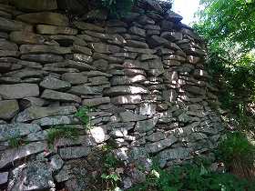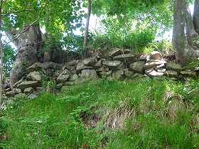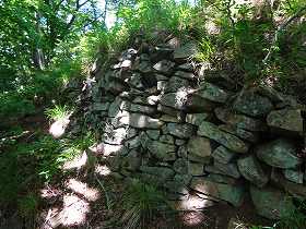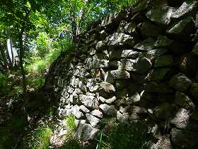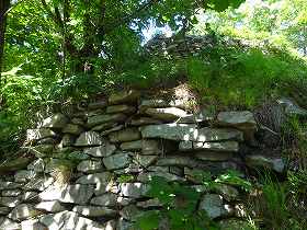 | 西尾根には堀切が2本あるが、明瞭なものではない。 | 1郭下腰曲輪の石垣。上方には1郭石垣も見えている。 |