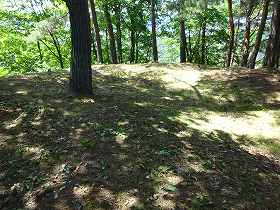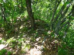 その先は自然地形の平坦な地形になっている。平坦なため郭のようにも見えるのであるが、周囲の切岸加工はまったくされておらず、要するに自然地形のままである。その東南端がピーク状に高くなっており、その北側に浅い土塁のようなものが見られる。しかし、これは城郭遺構というよりは、山頂部分と同様の古墳関連の遺跡のように思われる。