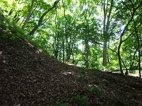| 10郭内部。草が茂っていて分かりにくい。 | 4郭の城塁。高さ8mほどと、かなり高い。 |