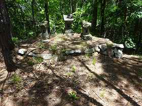 尾根を歩いている途中で、突然切岸のような土手が現れ、その上に石祠が祭られている。それに登ってみると、その上にももう一段、小規模な郭のようなものがあり、先端の土塁の上に3つの祠が祭られていた。そういえば、下の案内板には、天城城に向かう途中に「明聖霊神」と書かれた部分があった。天城城に向かう途中の尾根に、このようにして神を祭った場所が設置されていたのである。この辺りの位置であったと思う。