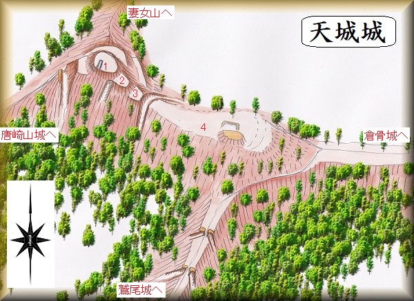 | 鞍骨城に向かう途中の尾根筋にあるこの城は、鞍骨城への関門として重要な機能を有している。そのため、天城城は、鞍骨城の出城としての機能があったものと考えられる。 となれば、やはり清野氏に所属した城であったということになる。 |