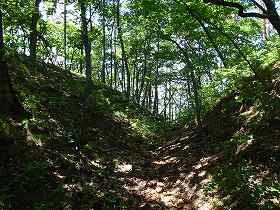 それを過ぎて進んて行く。勾配は相変わらず緩やかで、たいしてきつい道ではない。そうして10分くらい進んだところ、いきなり堀切が現れてきた。尾根筋を分断しているもので、深さ5mほどもあるしっかりしたものである。いよいよ城域内に入ったのか?