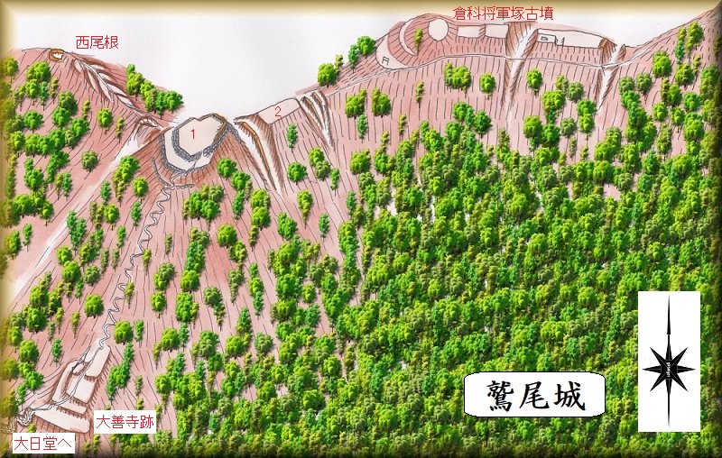 鷲尾城と唐崎山城とは、同じ山稜先端にある城で、しかも南北に向かい合っているが、その形状はかなり違う。唐崎山城は古風で鋭さの少ない城であるのに対して、こちらは石垣も構築し堀切の規模も極めて大きい。戦国末期まで使用されていた城のような印象を受ける。