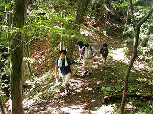 南の須賀尾峠の方から続いた峰が、いったん下がって馬の背状になっているため、丸山は完全に独立山の形態を成す。そのためこの部分は天然の大堀切となっている。写真は堀切部分から丸岩方面に登っていくところ。昨日の台風一過のため、斜面は滑りやすい。