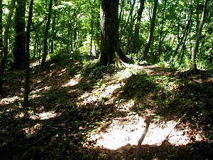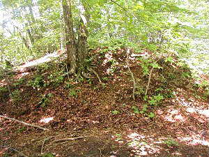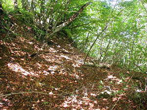 尾根道が高くなり、一見土塁のようにも見える。図の(う)の辺りである。「城郭体系」によると、これは風除けのために土塁で、これがなけらば強風の際には通行できなくなる、と書いてあった。しかし、これが本当に土塁であるのかどうかは疑問の残る所である。高さも1m未満で、この程度では、風除けにもならないのではないかと思われる。しかしまあ、崩れてしまったのかもしれず、そこは何とも言えない。