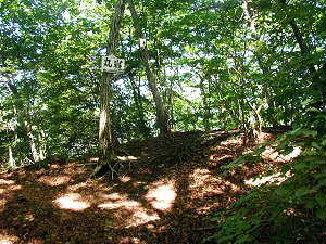 これが1郭。最高所である。とはいえ、6m×9mほどの狭い空間でしかない。周囲には50cmほどの低い土塁があるが、この形態からすると、これは郭というより、狼煙台ではないだろうか。周囲の土塁は、狼煙を燃やすための風除けのもののように見える。このスペースでは、まとまった兵力を駐屯させることはとてもできまい。