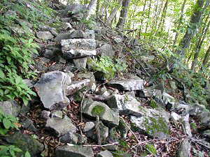 登城路の途中には、写真のように、まるで人工的に平に削ったかのような石がごろごろしている。石材としては良好で、ちょっと手間を掛ける気さえあれば、そうとうの石垣も組めるであろう。しかし、そうしていない所を見ると、そこまできちんとした城に仕上げるほどの気持ちはなかったものであろう。
