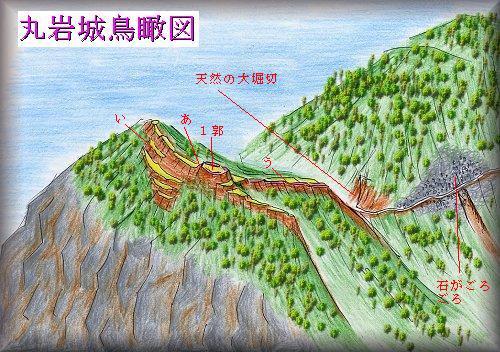 (03.8.10)丸岩城は真田昌幸が築いた城であったといわれる。天正10年以降、南側の須賀尾峠を越えて進入しようとする北条勢を押さえるために置かれた城であった。鳥瞰図は南西上空から見たもの。標高1130m、比高350mの丸岩山の山上が城址である。しかし、険しく、尾根の細い山であるため、郭を造るようなスペースはほとんどなく、小規模な砦というような城である。山頂の1郭も6m×9mほどしかなく、ほとんど居住性はない。尾根が土塁状になっている部分、数段の腰曲輪などに人工の跡が見られるが、ほとんどは自然地形なのである。本当に城なのかどうか疑問も残るが、目立つ山なので、ここに城を築いたというだけでかなり示威的な行動であったかもしれない。