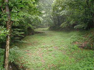 1郭南側の(お)の辺りを見た所。小規模な空堀構造となり、この下側が南郭ということになる。