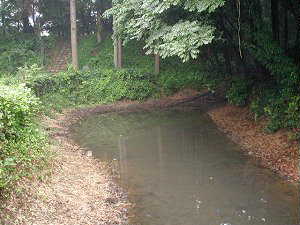 (い)の部分の堀。というか、もともと川だったのかもしれない。左端の方には、現在も小川が流れる。この堀はしだいに深くなって、下の沢に続き、やがて都幾川と合流する。