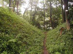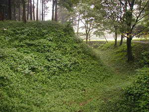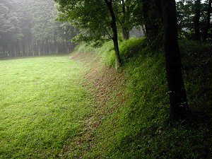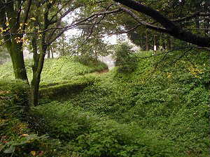 2郭外側の堀。散策路が造られている関係か、堀が一部埋められてしまっているようである。堀幅はもともとは10m近くはあったであろう。