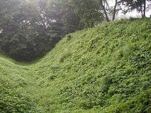 1郭虎口の土橋のところから、(え)の城塁を見た所である。堀の深さは6,7m幅は8,9mほどある。