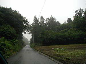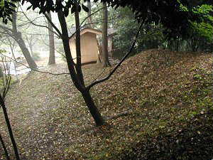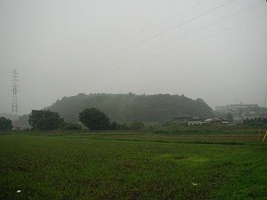 雨に濡れる杉山城を南側から遠望したところ。いい加減に、天気よなんとかなれー!
