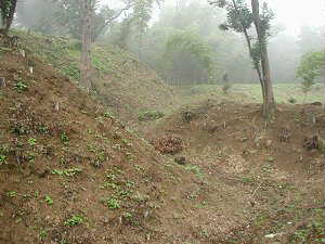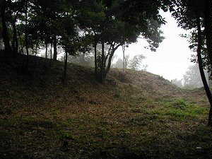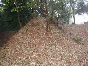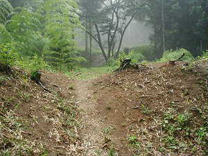 南2郭と3郭とを区画する土塁(う)。虎口の左側の部分の外側には空堀があるが、こちら側にはなく、ただ2mほどの高さの土塁一本を配置しているだけである。