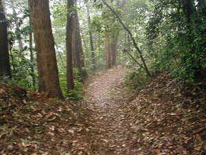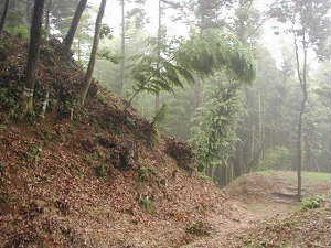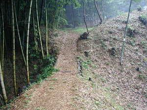 馬出しから、南3郭に続く土橋。写真右側はきれいに草が刈られていて整備されているが、左側は竹やぶのままで非常に暗い。対照的である。ただし、この竹やぶの中の堀は深くて迫力がある。