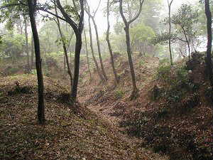 大手口を入ると(あ)の部分になる。写真は(あ)の右手で、堀の間に土壇を入れて二重堀のような構造となっている。