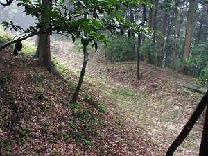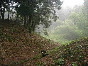 井戸郭と本郭との間の空堀。やはり土橋などはない。木橋が架かっていたのであろう。現在は、いったん堀底に下がってから、また本郭に上がっていくことになる。