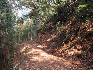 (あ)の切通し部分から1郭に登っていく(い)の道。城塁沿いのこの細い道を上がって行く事になるのだが、この左側下には二重の空堀が穿たれており、右手上の城塁からの攻撃にまともにさらされることになる。