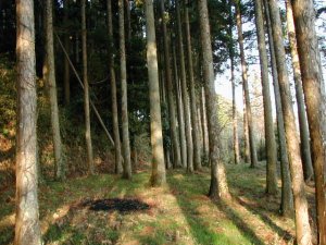 上がったところが1郭となる。郭内の右半分は浄水施設と杉林となり、だいたいの状況は分かるが、西側の方は笹が密集していて、郭の形がよく分からない。