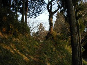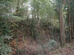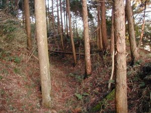 2郭と3郭との間から、今度は3郭に上がる(く)の虎口を見た所である。両脇は土塁で、幅は人が一人通れるくらいしかない。この狭さからして旧状のままであるのかもしれない。ここから進入すると3郭ということになるが、3郭は地勢が南に傾斜しており、削平が甘い感じがする。また東側の斜面も比高5mほどと、それほど高くもなく、要害性という観点からは、劣って見える郭である。