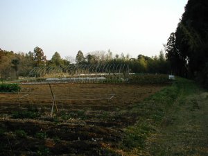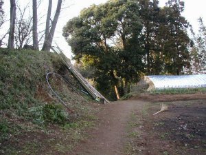 (あ)の切通しの辺りから、3郭を見た所である。下の畑と3郭との間には4mほどの比高差がある。しかし、この下の畑は台地下に緩やかに続いており、この部分を通れば、台地下から郭内に用意に侵入できてしまうのである。