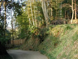 1郭と2郭との間の(あ)の切通しの部分を北側から見た所である。車道を通すためにやや広げられているとは思うが、だいたい旧状も、これとそう変わりはなかったであろう。郭内までは6mほどの比高差がある。かつては木橋によって連結されていたのではなかろうか。