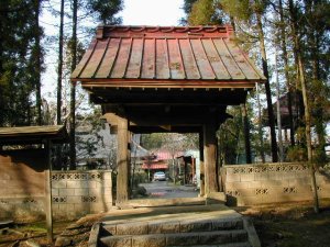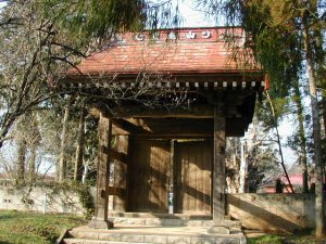 「房総の古城址めぐり」によると、この寺院にある2つの門は助崎城の廃城の際に、城から移築されたものであるという。この写真の門は寺院の中門で、本来は助崎城の大手門であったという。大手門にしては少し小さいかなとも思うが、それより気になるのは、門脚が大部弱っているようで、東に少し傾いていることである。思いっきり押したら倒壊してしまいそうだ。城門の遺構というからには貴重な文化財であると思うのだが、成田市はこの伝承を信用していないのか、特に保存の手を打っていないようである。
